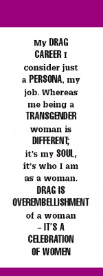 “My drag career I consider just a persona, my job. Whereas me being a transgendered woman is different; it’s my soul, it’s who I am as a woman. Drag is overembellishment of a woman – it’s a celebration of women.”