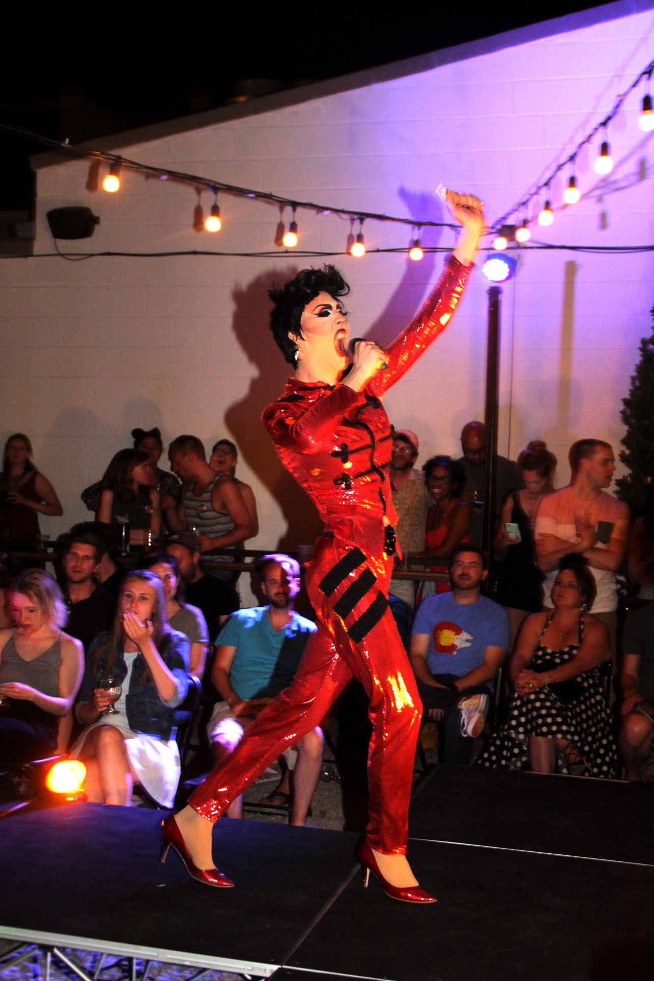 The host also helps to pick queens who will perform on a makeshift stage that has been set up in the brewing area,which can be seen through two double, glass doors just to the right of the bar. This past summer, though, a raised platform stage for the drag show was set up in the outdoor patio space which was added to Ratio this past year.