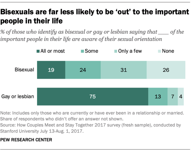Bi folks were also four times less likely to be out to those they love, at 19 percent compared to 75 percent of gay and lesbian folks. They are more likely to only come out to close friends and family or a select group of people, if at all.