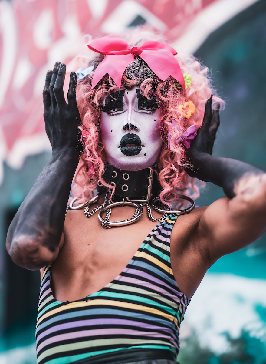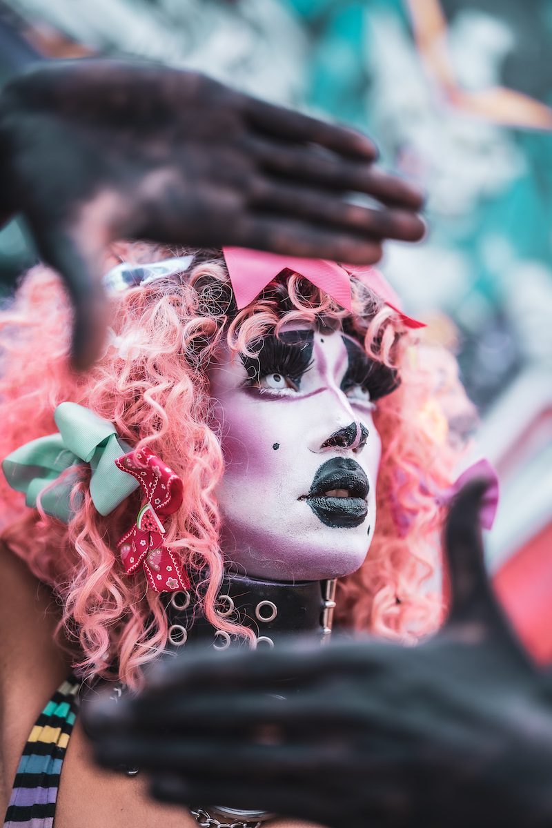 While model Harlequin Cheshire Glamour lives in St. Louis, Missouri and is a part of the House of Glamour, they’re also a sibling of the House of 666, model Lisa Frank 666’s drag house. The distanced shoot brought the models closer through collaboration.