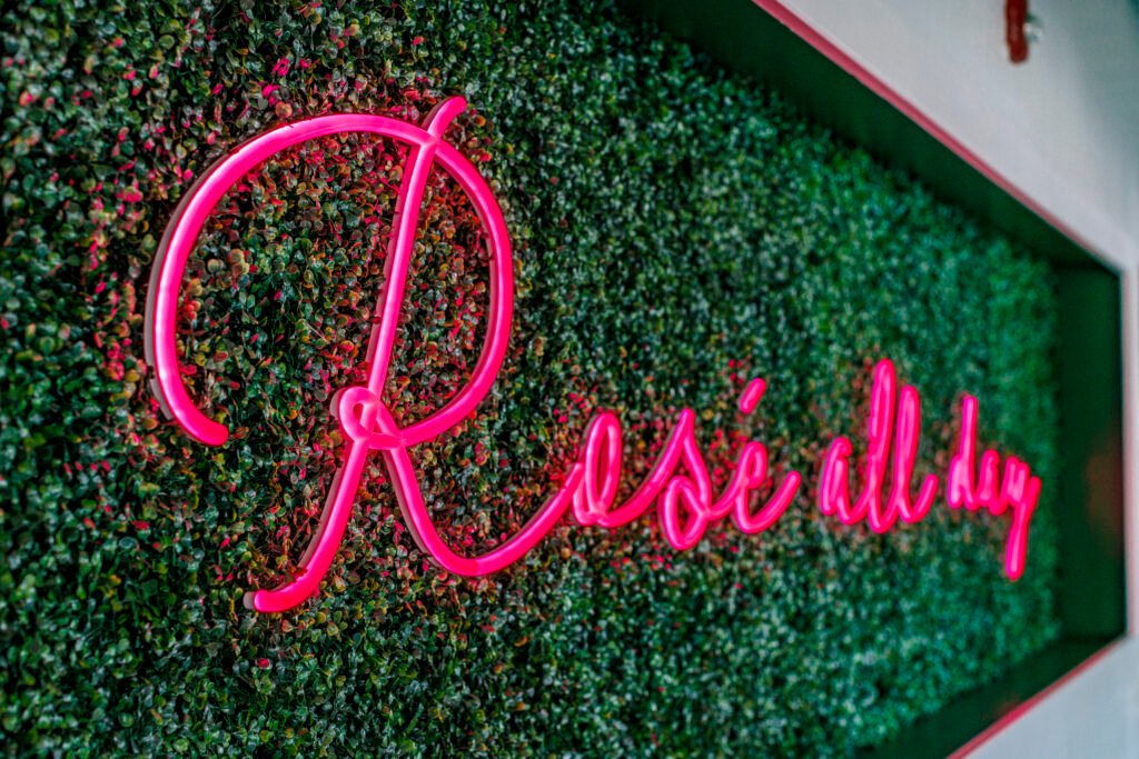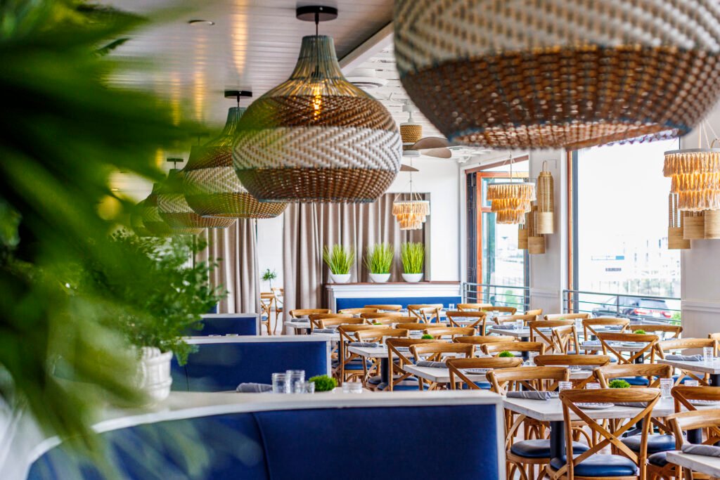 Walk through the doors and the tone shifts immediately. Gone are the dark woods and industrial edges that define so many Denver dining rooms. In their place: whitewashed brick, pale oak floors, woven pendants, soft maritime blues, and light that seems engineered for golden hour. The space doesn’t just look bright—It feels buoyant. Plush banquettes curve in inviting arcs. Brass accents warm the room without weighing it down. And hovering above it all, the glowing “Rosé All Day” sign winks like it knows exactly why you’re here.