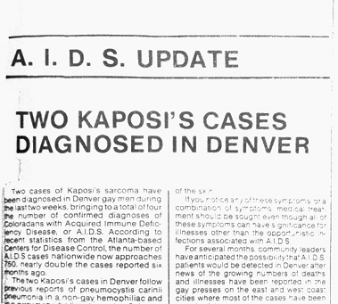 In November 1982, the story came home: Out Front reported that four AIDS cases had been discovered in Colorado, with two cases of Karposi’s Sarcoma. (6) The column advised of the symptoms, including fatigue, weight loss, fevers, enlarged lymph nodes and dark lesions. Another piece in the same issue was the first to suggest condom use, noting that “a significant difference between men with the diseases and men without them is that the former are far more likely to be the receptive partner in anal intercourse.”