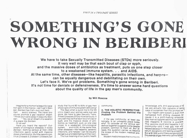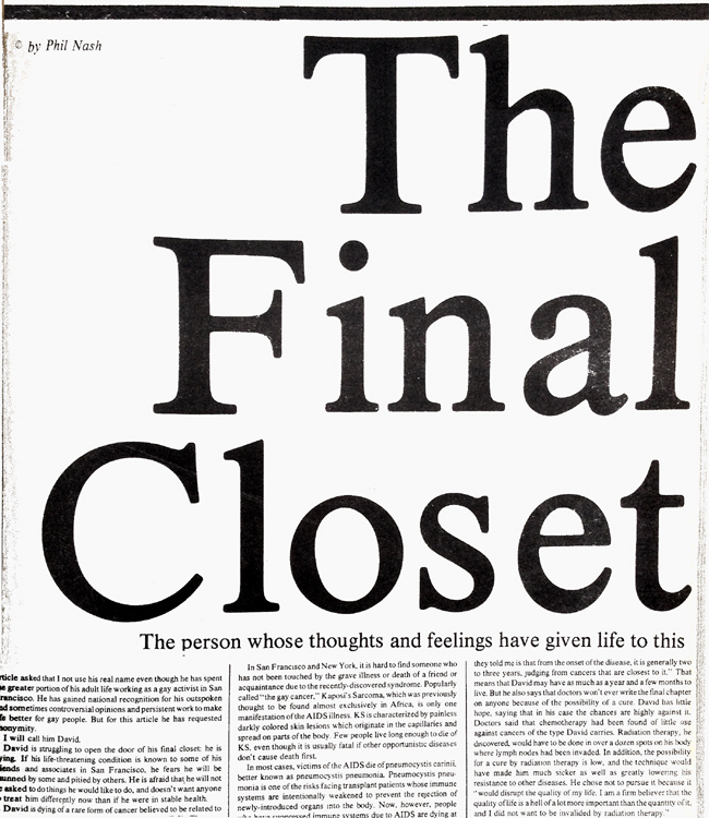 The second June issue of Out Front Colorado was the first to finally give the condition it’s name: Acquired Immune Deficiency Syndrome, introduced in contributor Phill Nash’s interview with an anonymous gay AIDS patient in San Francisco. In that city, Nash wrote, the disease was widespread – “In San Francisco and New York, it is hard to find someone who has not been touched by the grave illness or death of a friend or acquaintance due to the recently-discovered syndrome.” The story’s subject – dubbed “David” while concealing his real name, had suffered health problems for much of his adult life but doctors had finally informed him he was dying.