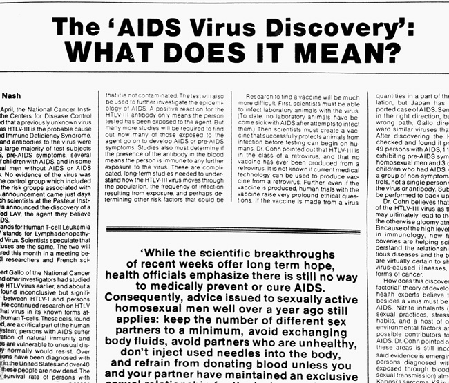 Yet the virus that causes AIDS was finally recognized, and its transmission was beginning to be understood – meaning that workers and activists could reach out with education, research new treatments and work on treatment and cures. While fear remained, the uncertainty was over, and for those dealing with HIV risk and friends and acquaintances suffering from the disease, there was hope.