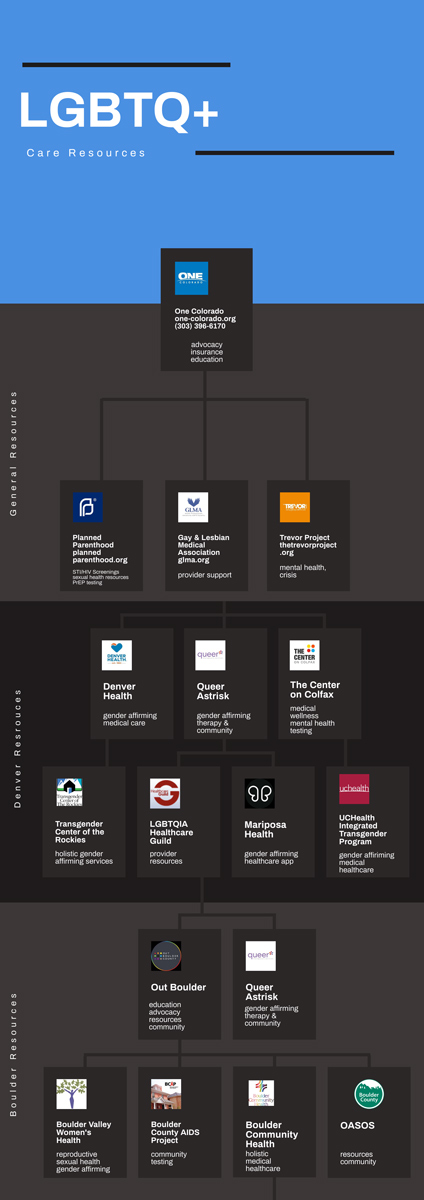 One Colorado provides resources, education, and advocacy for LGBTQ folks across the state. Visit the website at one-colorado.org/lgbtq-resources/health-resources-for-lgbtq-patients/ for detailed information on healthcare.