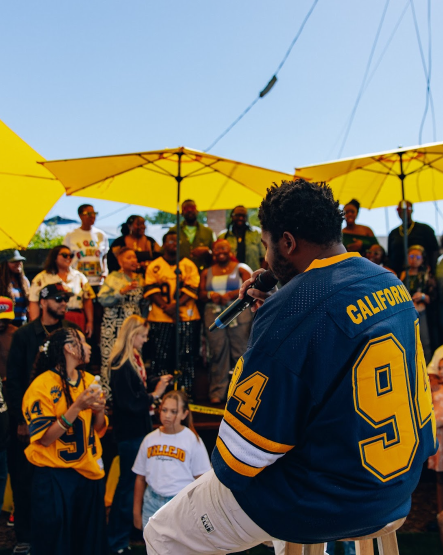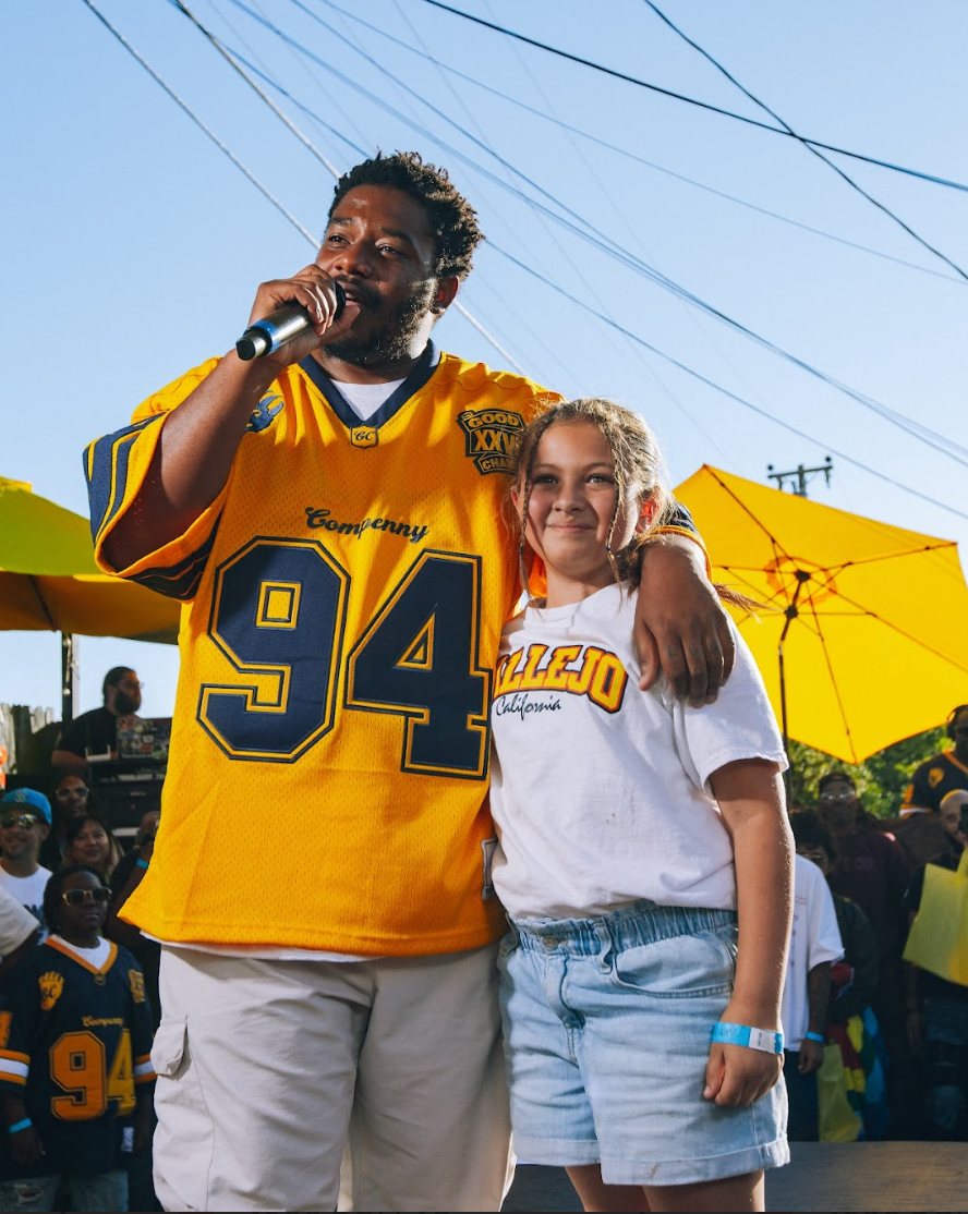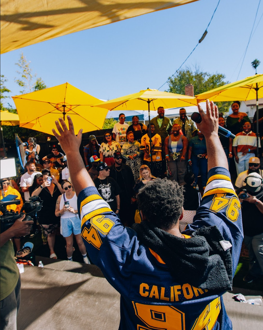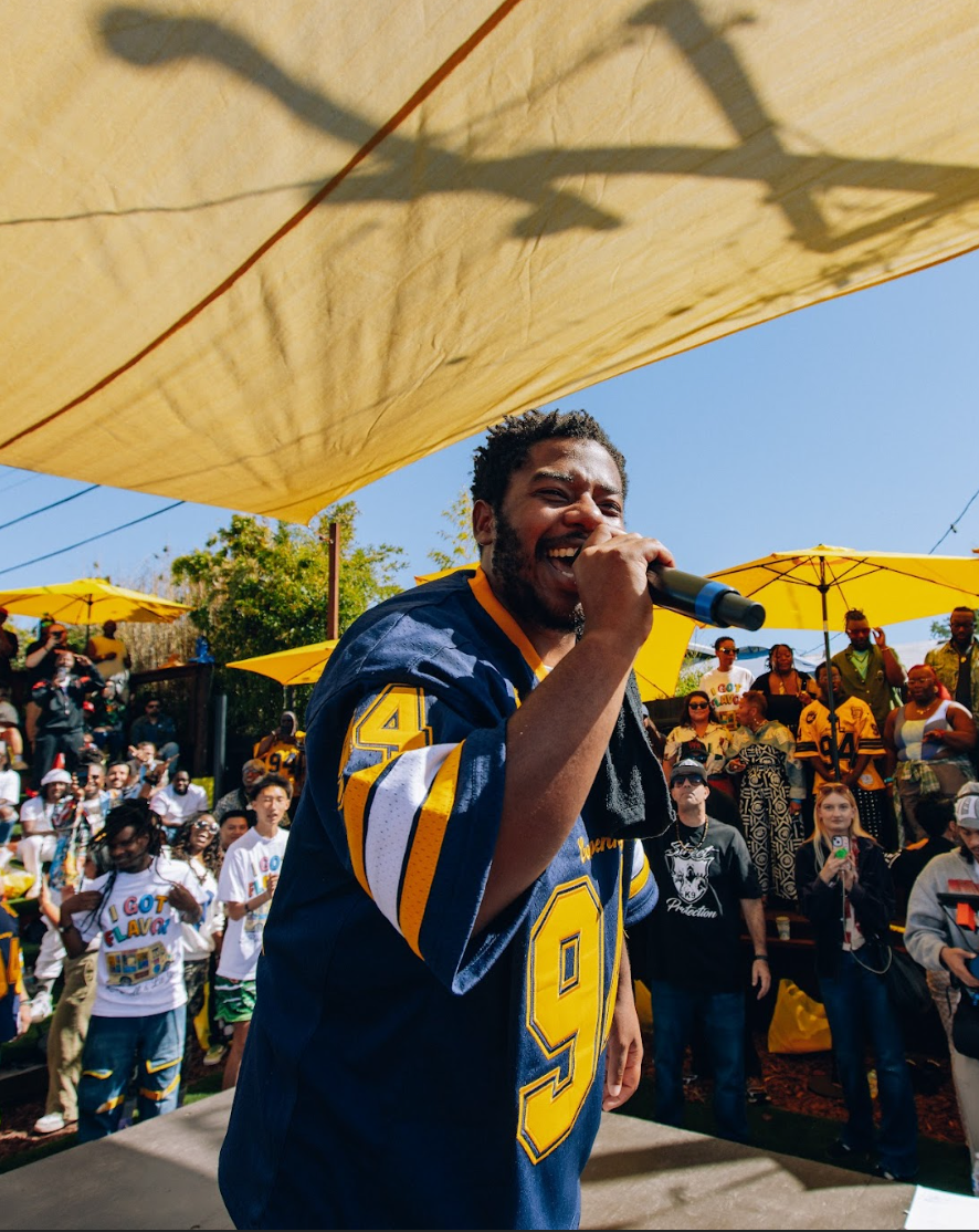 The address wasn’t some hillside estate or secret warehouse. Just a quiet, working-class street in Vallejo, California, on the edge of wine country. A ranch-style home with a front yard transformed into a full-scale production. There was a red carpet setup with press signage, a custom floral photo throne, and branded banners stretched across scaffolding. It had the finish of a professional event without pretending to be anything else. The garage was flanked by merch tables for Good Compenny, his label and lifestyle brand, stocked with more variety than most touring artists offer. Cal State-inspired jerseys in blue and gold were everywhere. Fans wore them like team colors.