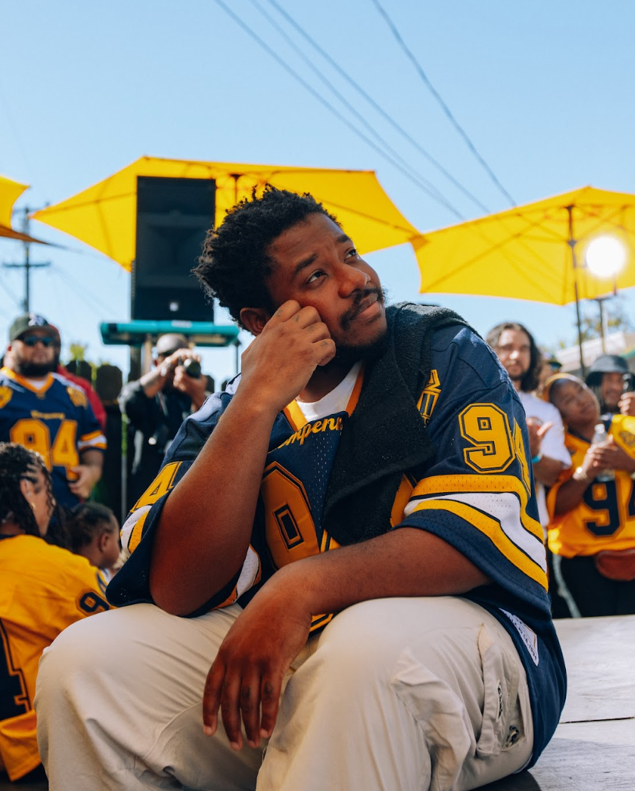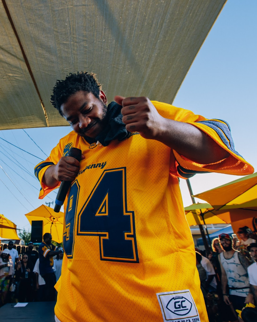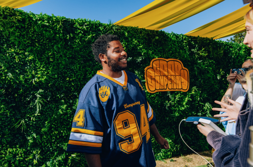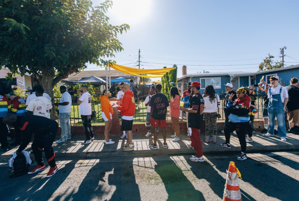 The address wasn’t some hillside estate or secret warehouse. Just a quiet, working-class street in Vallejo, California, on the edge of wine country. A ranch-style home with a front yard transformed into a full-scale production. There was a red carpet setup with press signage, a custom floral photo throne, and branded banners stretched across scaffolding. It had the finish of a professional event without pretending to be anything else. The garage was flanked by merch tables for Good Compenny, his label and lifestyle brand, stocked with more variety than most touring artists offer. Cal State-inspired jerseys in blue and gold were everywhere. Fans wore them like team colors.