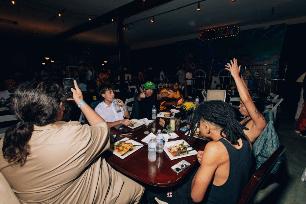There was a bit of a wait, maybe thirty or forty-five minutes, before we were let in. Inside, it felt like a celebration. White folding chairs, decorated tables, soft flowers. There were enough seats for everyone. I picked one out of the way and ended up next to the Parisian rapper I’d met earlier, along with a few new friends who had all connected through LaRussell’s social media. One of them had commented online that she was flying in for the show. Someone else replied, and now they were here together, real friends. One of them had even brought her mother. When LaRussell called to personally thank her for buying a ticket, she passed the phone to her mom. He decided to fly her out too. Just like that. That’s the kind of host he is. The kind of leader. The kind of person.