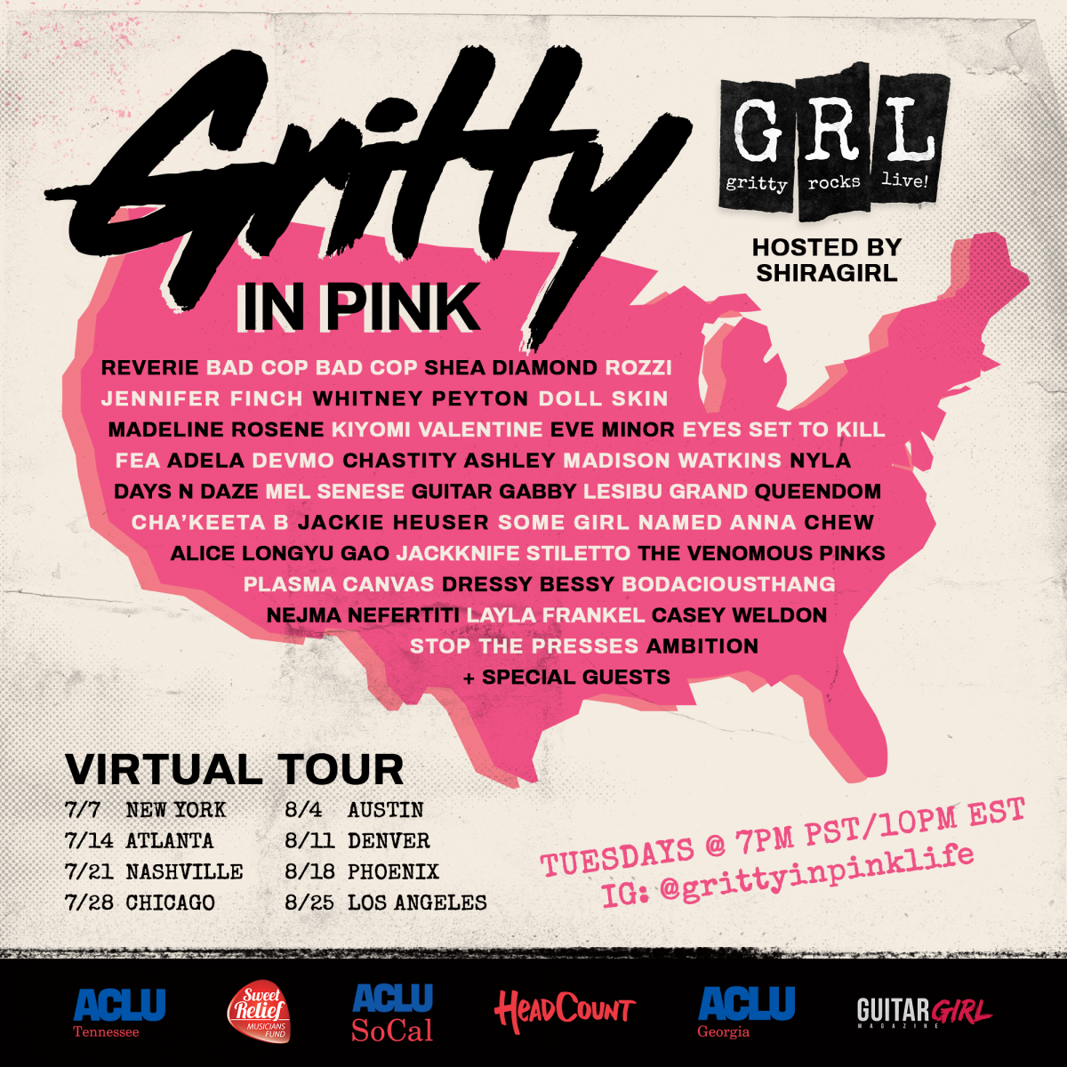 The tour is being hosted by Vans Warped Tour legends Shiragirl, the perfect, iconic, all-girl punk group to bring empowered, female artists together. Each night of shows will also feature a charity fundraiser, sponsored giveaways, intimate performances, artist interviews, and audience engagement. Not only is Gritty In Pink bringing local, female bands and their music to homes across America, but they are using their platform to help support those in the music industry. Their goal is to give back to communities who are still struggling during this economic downturn and pandemic.