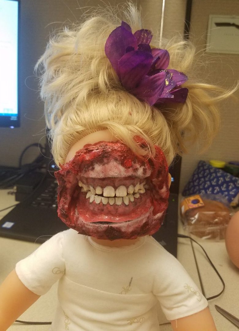 Upon first glance, Melanie Hatfield’s kitchen is what you’d expect from a working mom of two: well-stocked, lightly decorated, a baby doll sitting casually on the table with a grotesque, agape mouth of hyper-realistic human teeth replacing its face.
