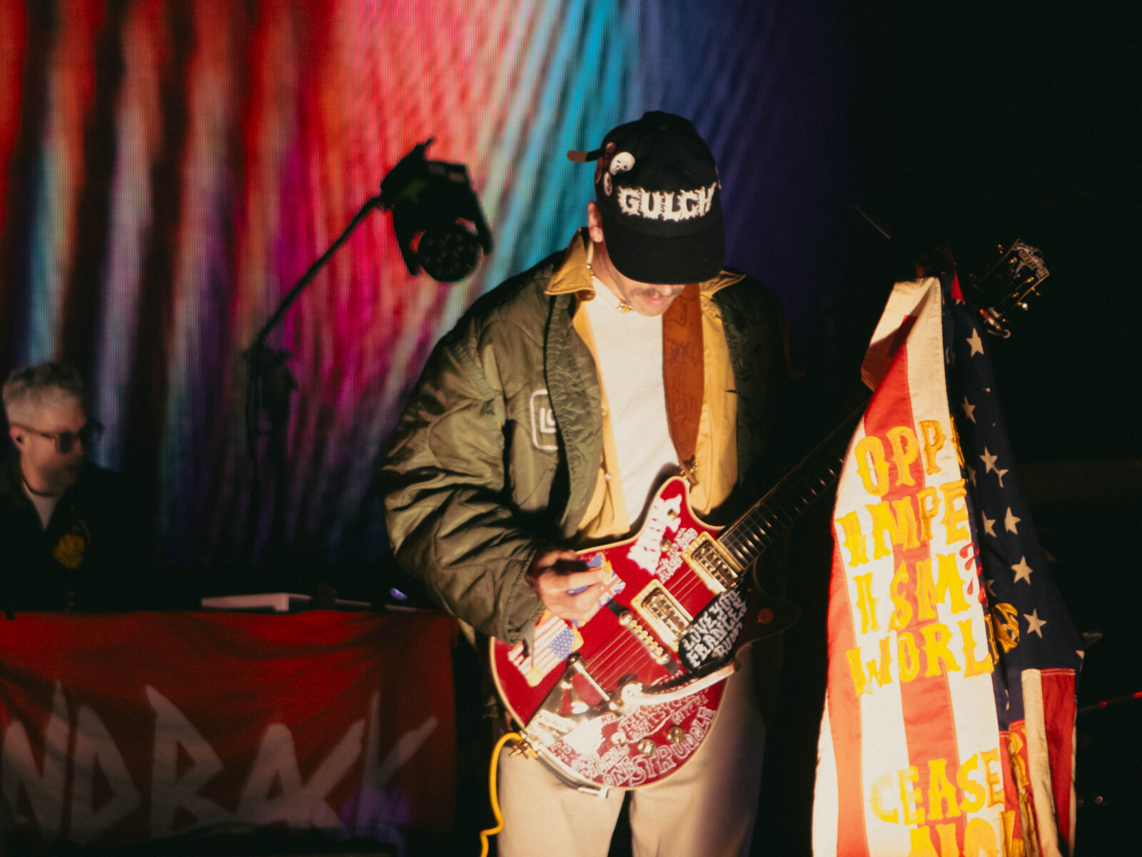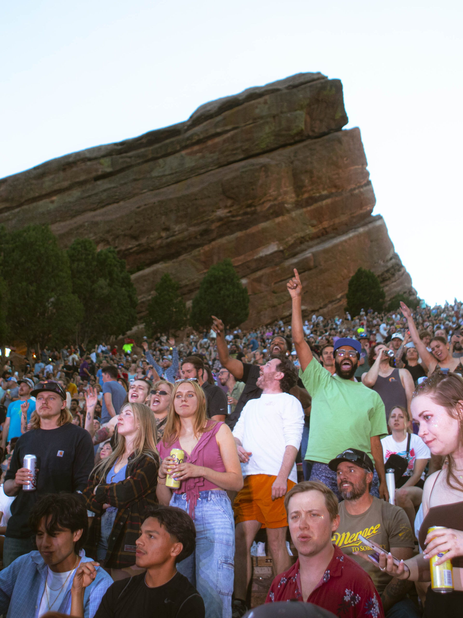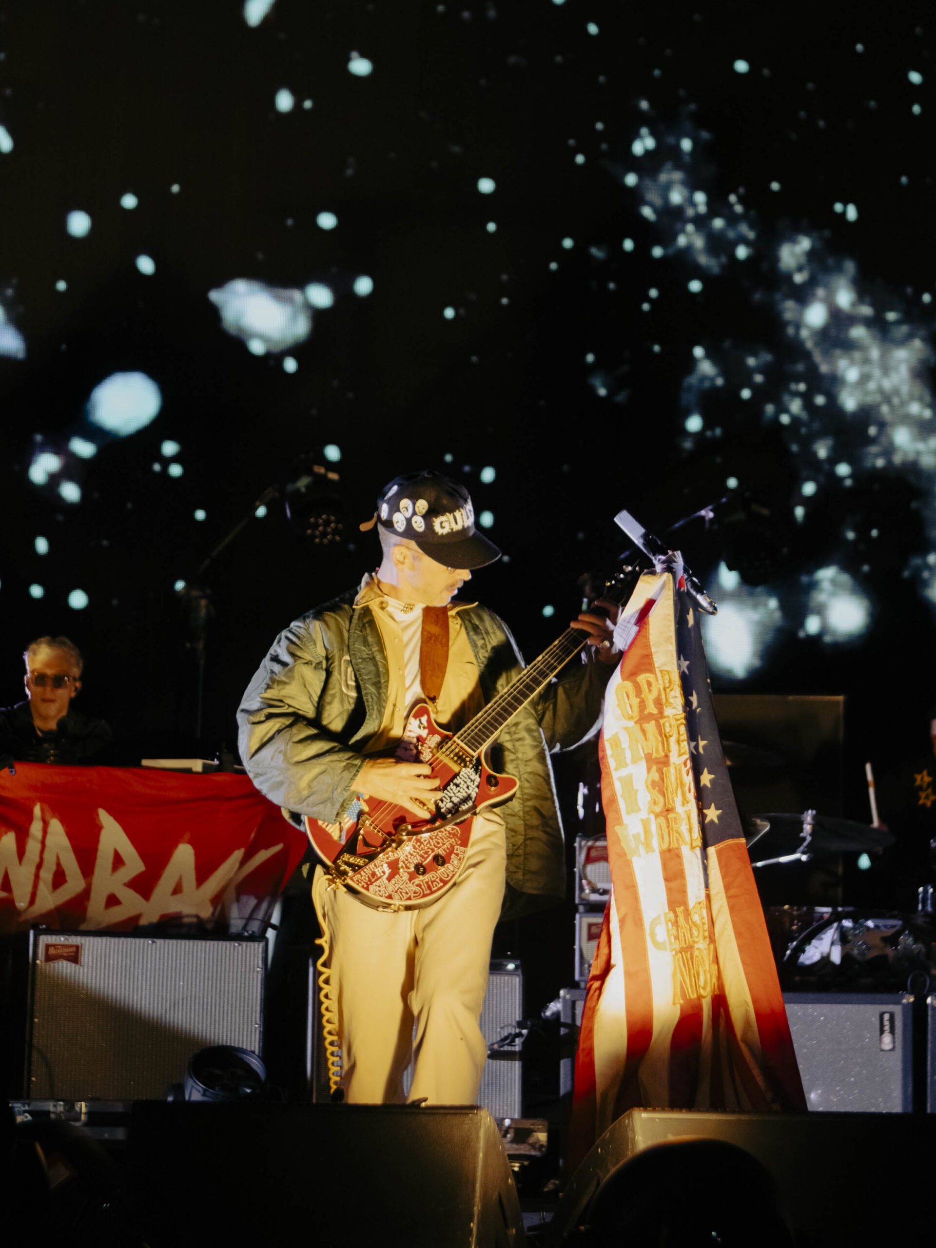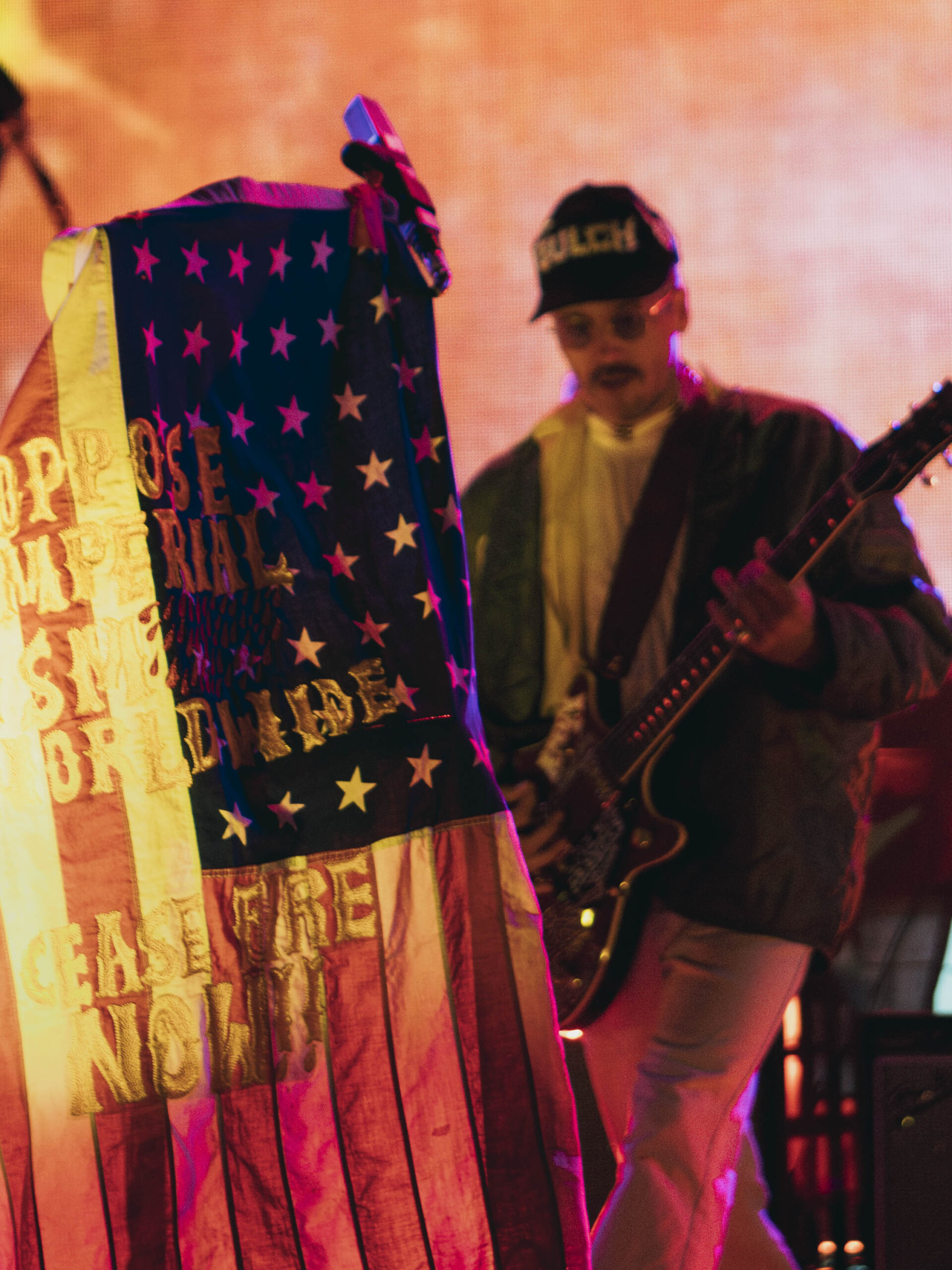 Portugal. the man started their set by welcoming members of the Stronghold Society (a non profit focused on inspiring Native American youth through music, arts, and skateboarding) to acknowledge the land. Walt Poureir, Director of the Stronghold Society, took his time to address the audience, mentioning how we are living in the Age of the Daughters. He stood next to two of his daughters as they took time to address the crowd as well, calling for a ceasefire in Palestine. Lakota Harden then led the crowd in thanking the rocks that produce such a beautiful home for music and culture in Colorado. The band has continuously advocated for indigenous peoples throughout their career, and it doesn’t stop there. In addition, the American Flag that hung from John Gourley’s mic stand read “Impose Imperialism Worldwide / Ceasefire Now!”