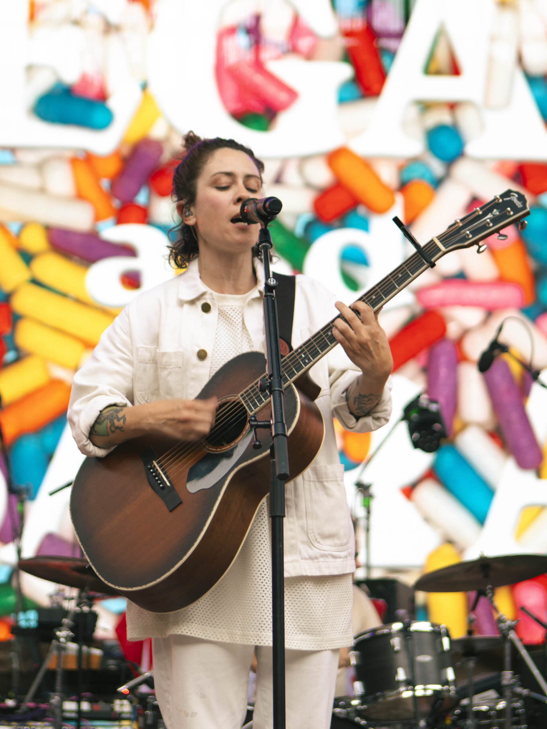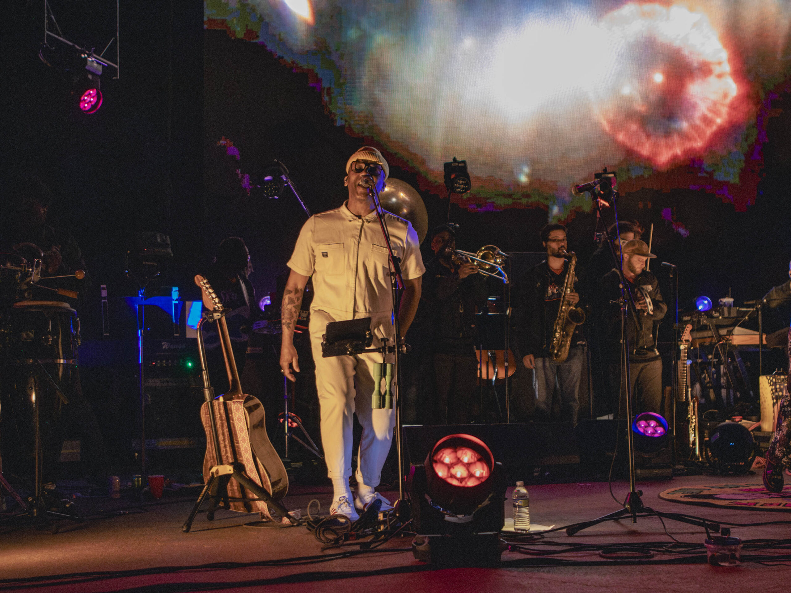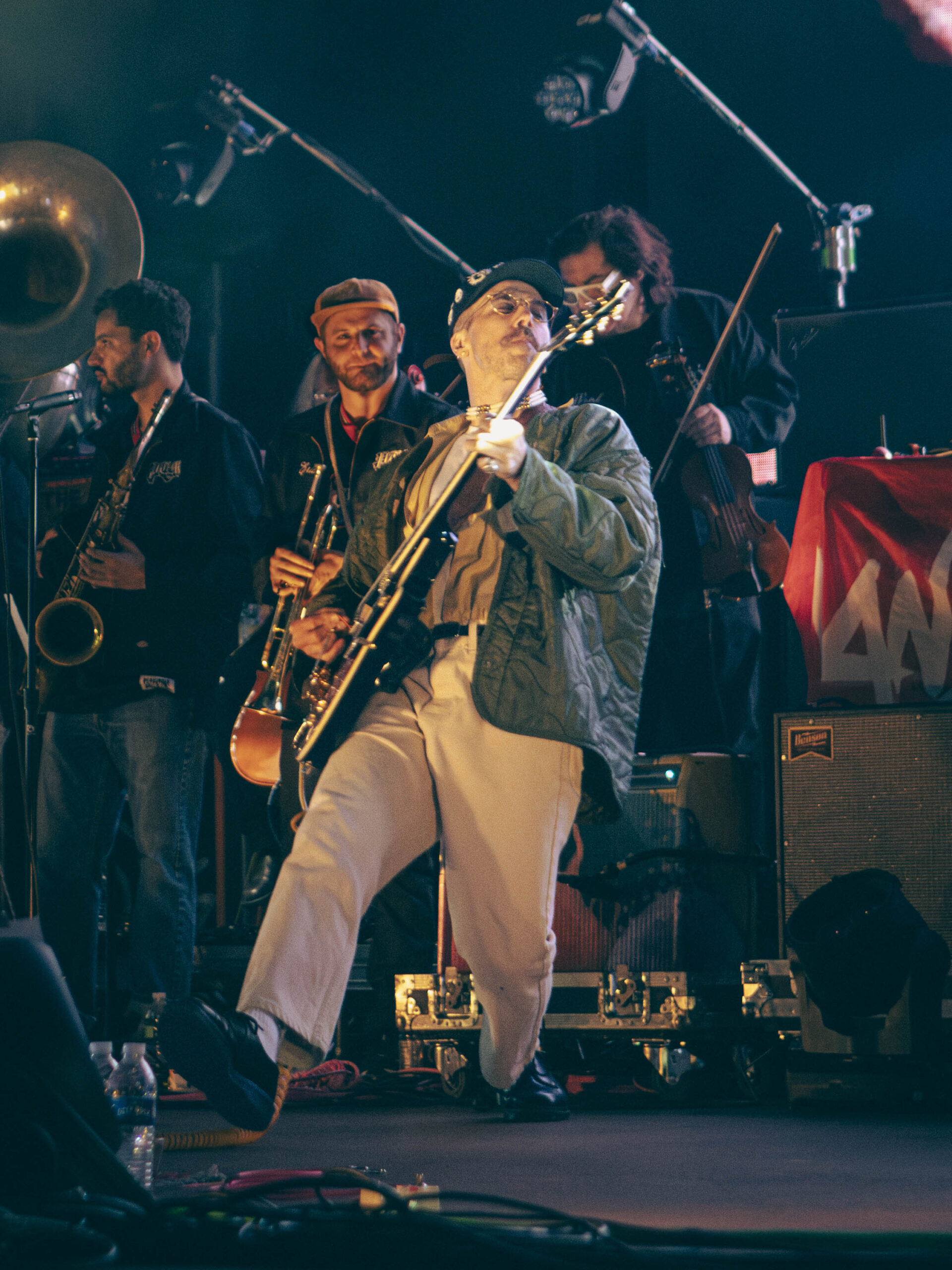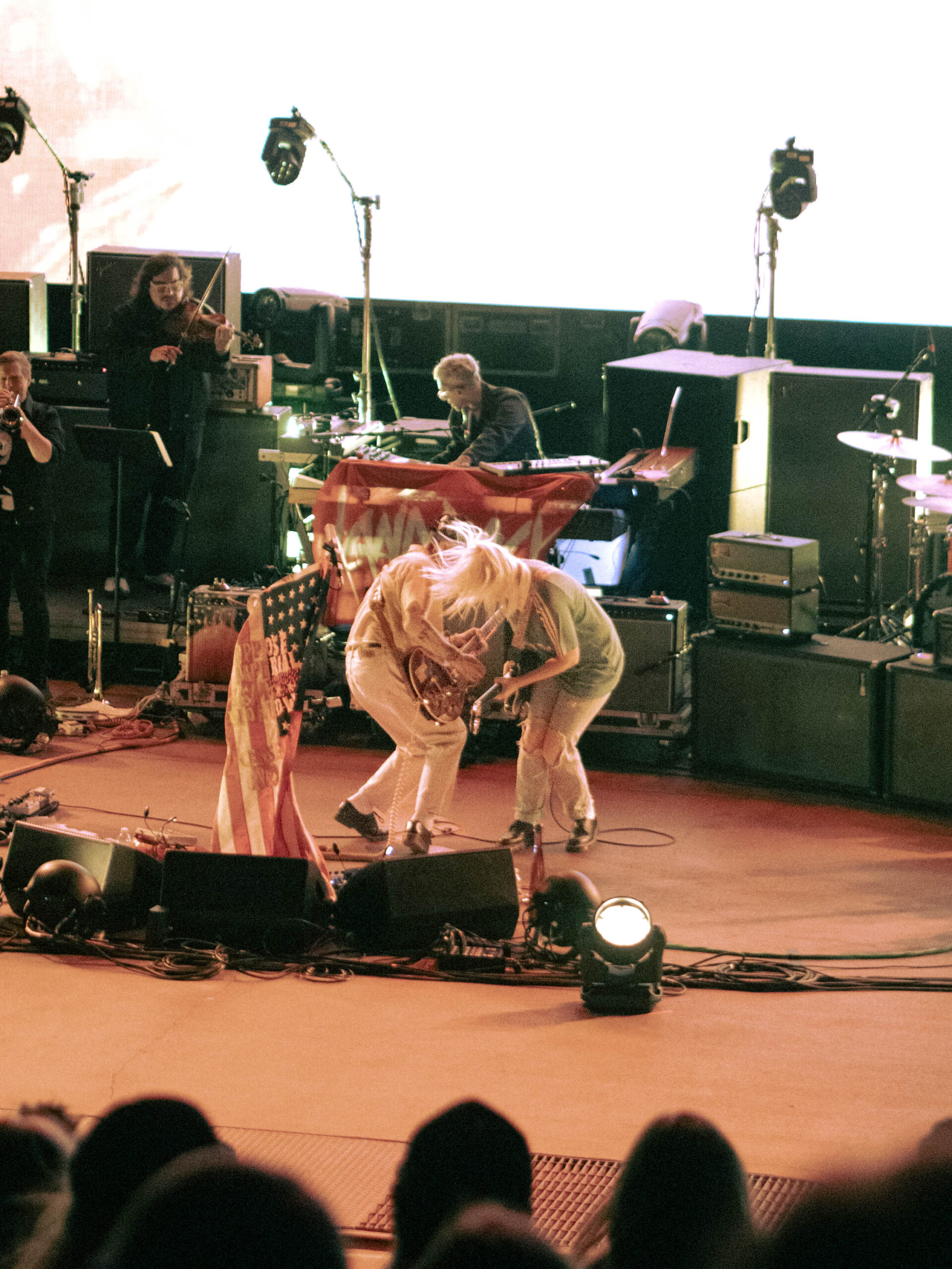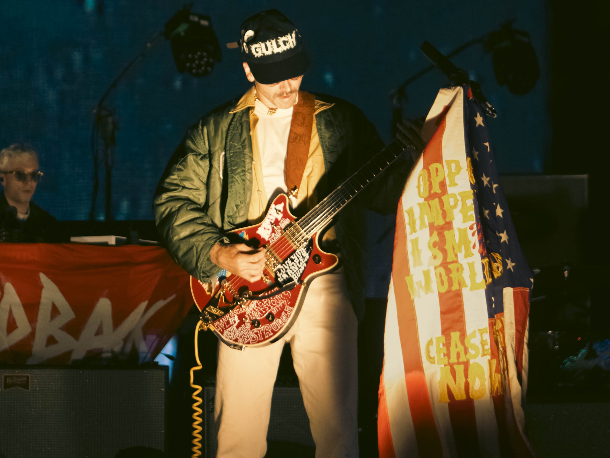 Portugal. the man started their set by welcoming members of the Stronghold Society (a non profit focused on inspiring Native American youth through music, arts, and skateboarding) to acknowledge the land. Walt Poureir, Director of the Stronghold Society, took his time to address the audience, mentioning how we are living in the Age of the Daughters. He stood next to two of his daughters as they took time to address the crowd as well, calling for a ceasefire in Palestine. Lakota Harden then led the crowd in thanking the rocks that produce such a beautiful home for music and culture in Colorado. The band has continuously advocated for indigenous peoples throughout their career, and it doesn’t stop there. In addition, the American Flag that hung from John Gourley’s mic stand read “Impose Imperialism Worldwide / Ceasefire Now!”