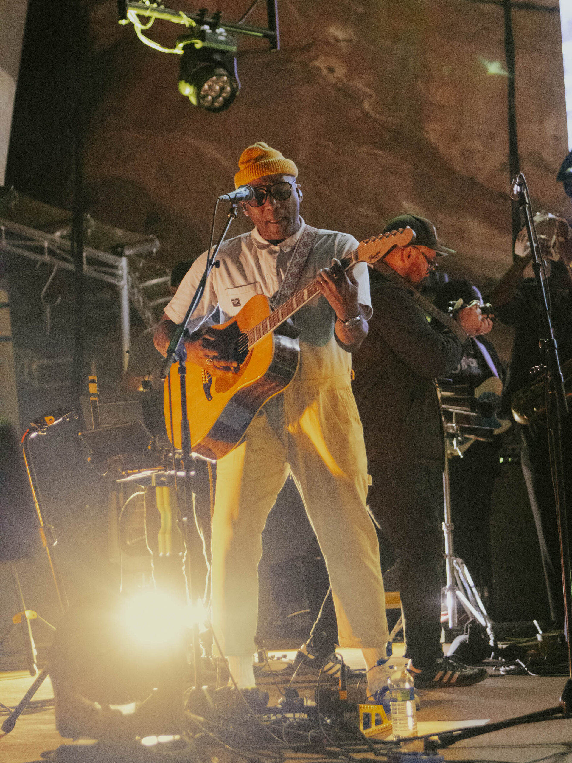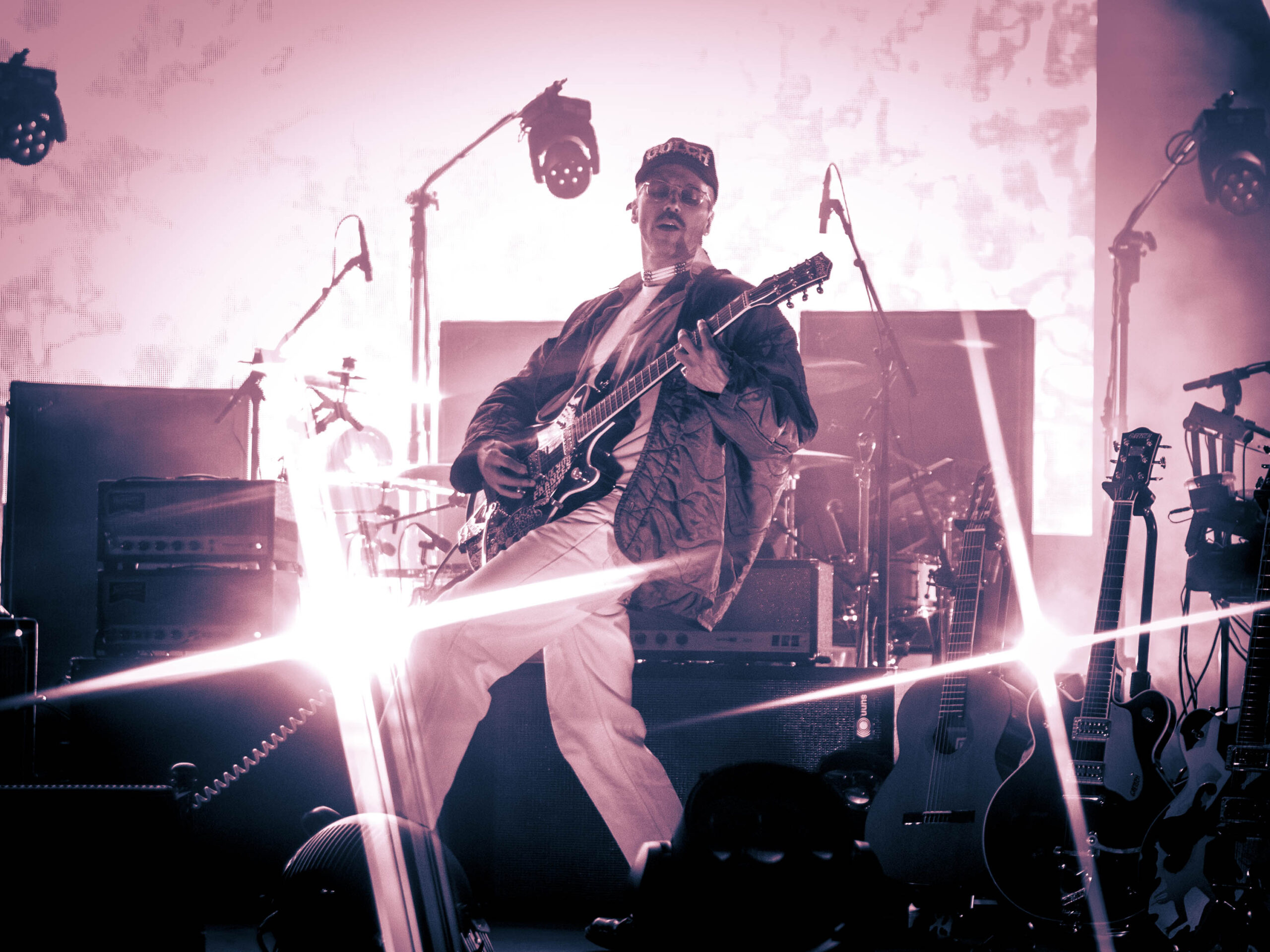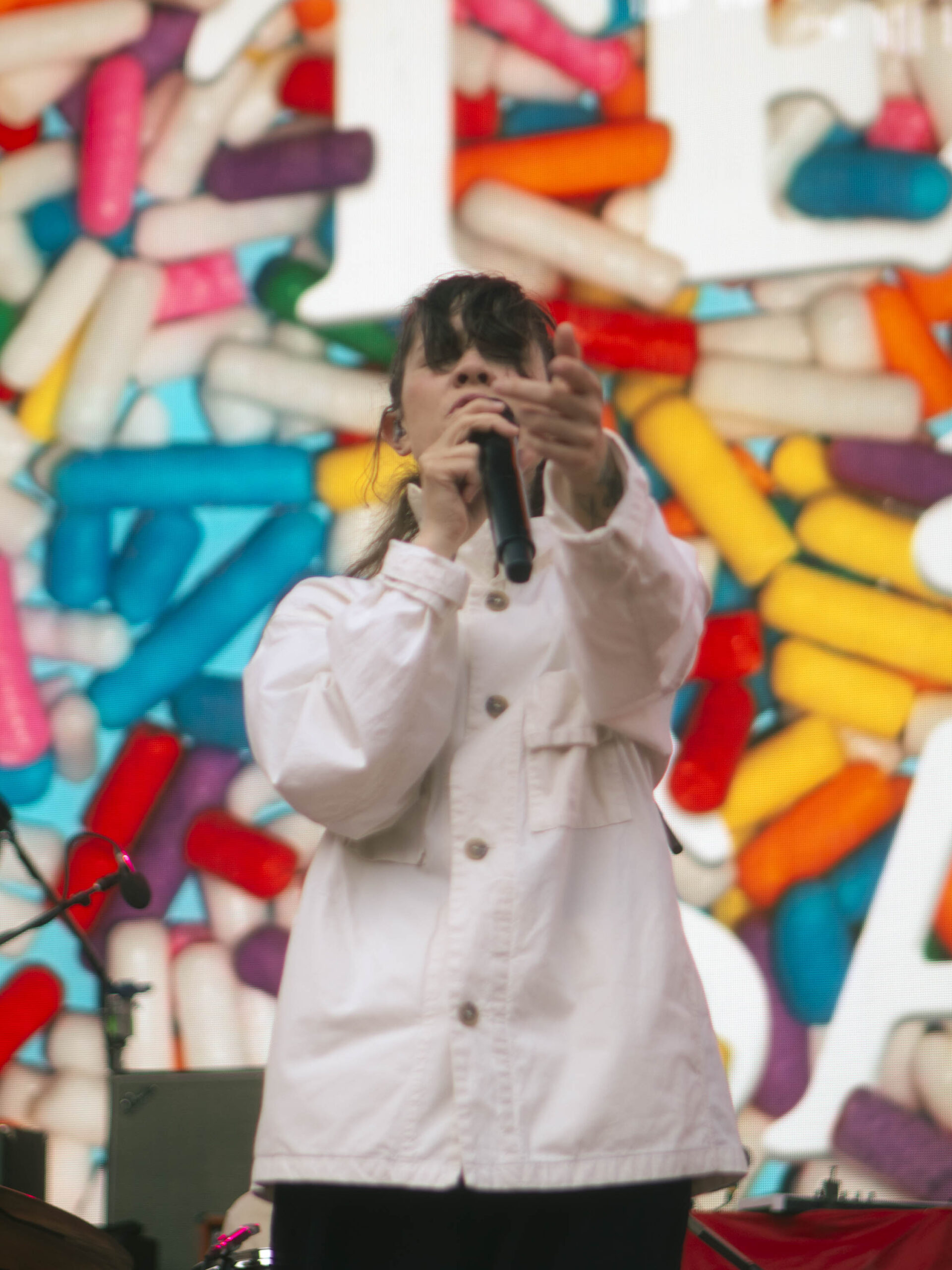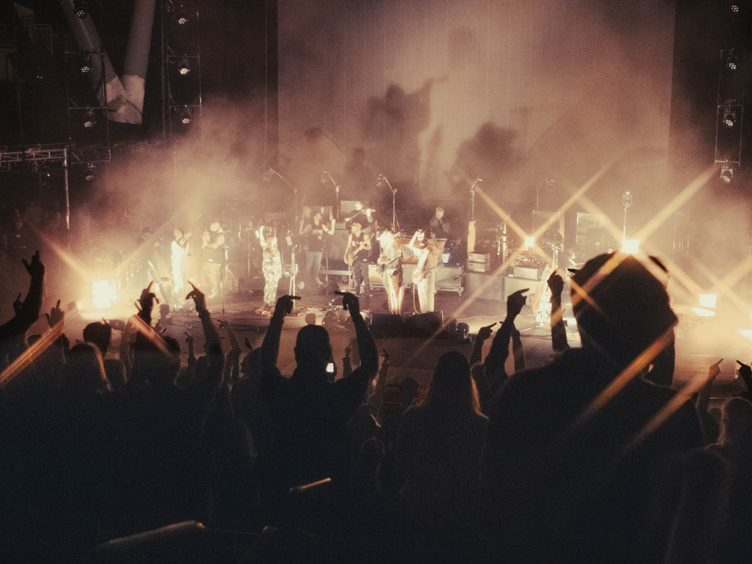 Portugal. the man started their set by welcoming members of the Stronghold Society (a non profit focused on inspiring Native American youth through music, arts, and skateboarding) to acknowledge the land. Walt Poureir, Director of the Stronghold Society, took his time to address the audience, mentioning how we are living in the Age of the Daughters. He stood next to two of his daughters as they took time to address the crowd as well, calling for a ceasefire in Palestine. Lakota Harden then led the crowd in thanking the rocks that produce such a beautiful home for music and culture in Colorado. The band has continuously advocated for indigenous peoples throughout their career, and it doesn’t stop there. In addition, the American Flag that hung from John Gourley’s mic stand read “Impose Imperialism Worldwide / Ceasefire Now!”