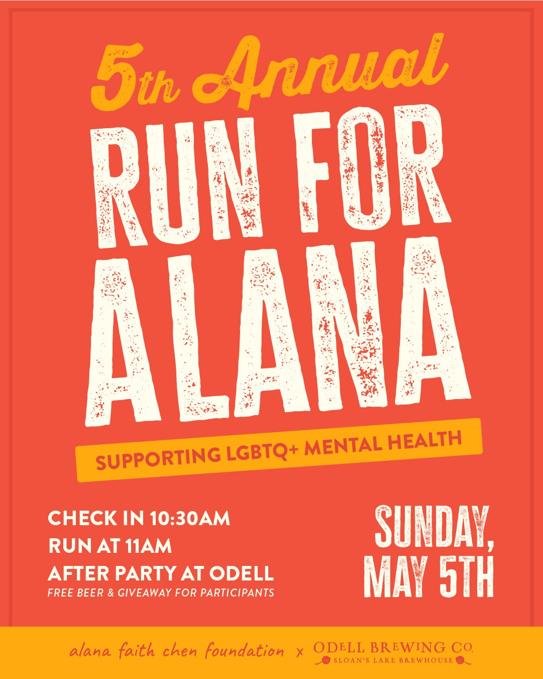 The 5th annual Run for Alana is happening at Odell Brewing Sloan’s Lake in Denver or virtually. AFCF is asking those to 3 miles of either walking, running or biking as they raise awareness for LGBTQ+ mental health. Why 3 miles? LGBTQ+ youth are 3x more likely to attempt suicide than their peers. The goal is to raise $7,500 for 100 free therapy sessions for those in critical need. As of 5/1 the goal is halfway met. Check in starts at 10:30 and the run begins at 11am. At 12pm Odell Brewing is hosting an after party with free beer and a giveaway for participants.
