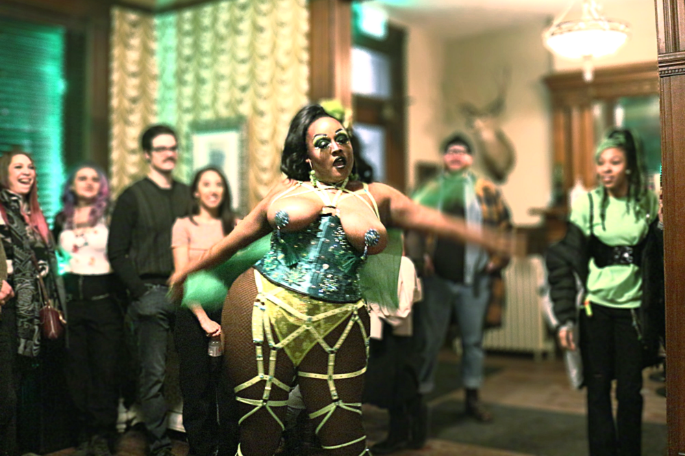 Lala Queen (she/her) has been doing drag for 10 years, making her the show’s longest performing queen. February’s show was her first time appearing in Chronic High on Heelz, but Lala was right at home in the MJ Mansion. Lala Queen describes her drag as “a mix of old and new,” adding trendy twists to classic Hollywood glamour.