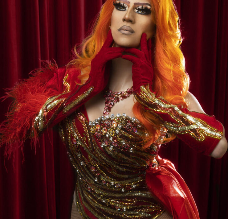 “My drag is high-energy; outside of drag I like to promote positive energy, like love and light, that’s just who I am, I think bringing that to my drag and making it fun for everyone is a major theme for me,” Samora tells OFM. “Ultimately we’re all coming to shows to feel something, and I wanna make sure that what I’m doing as a host or show producer brings that to life.”