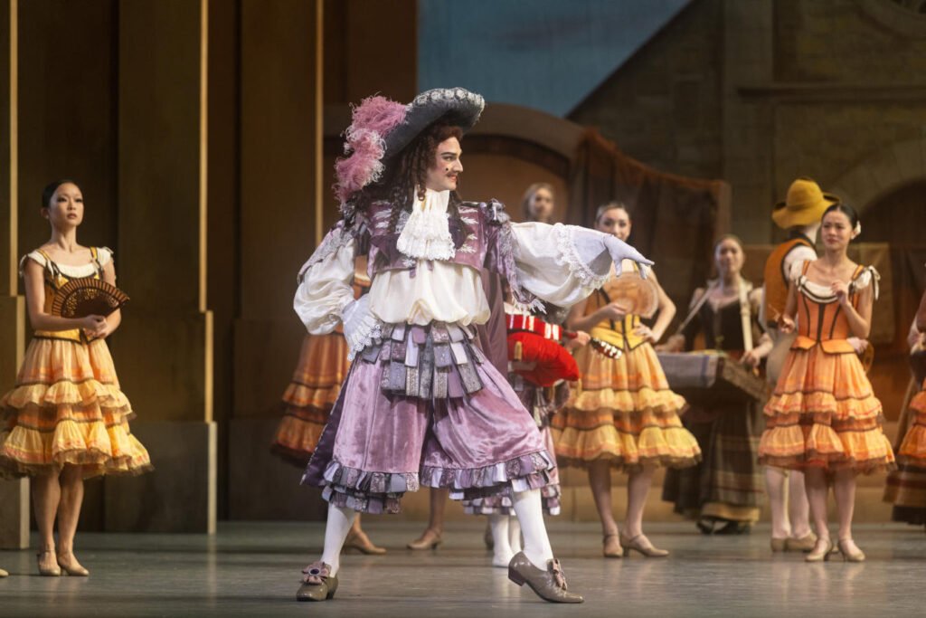 Narratively, Don Quixote remains one of ballet’s most charming bargains. In San Francisco Ballet’s own guide to the work, Kitri and Basilio are the central lovers, Lorenzo is the father standing in their way, Gamache the ludicrous aristocratic rival, Mercedes and Espada the glamorous side couple, and Don Quixote and Sancho Panza the wandering pair whose quest keeps colliding with the lovers’ story. In the dream scene, Don Quixote sees Kitri as Dulcinea, the idealized woman of his imagination.
