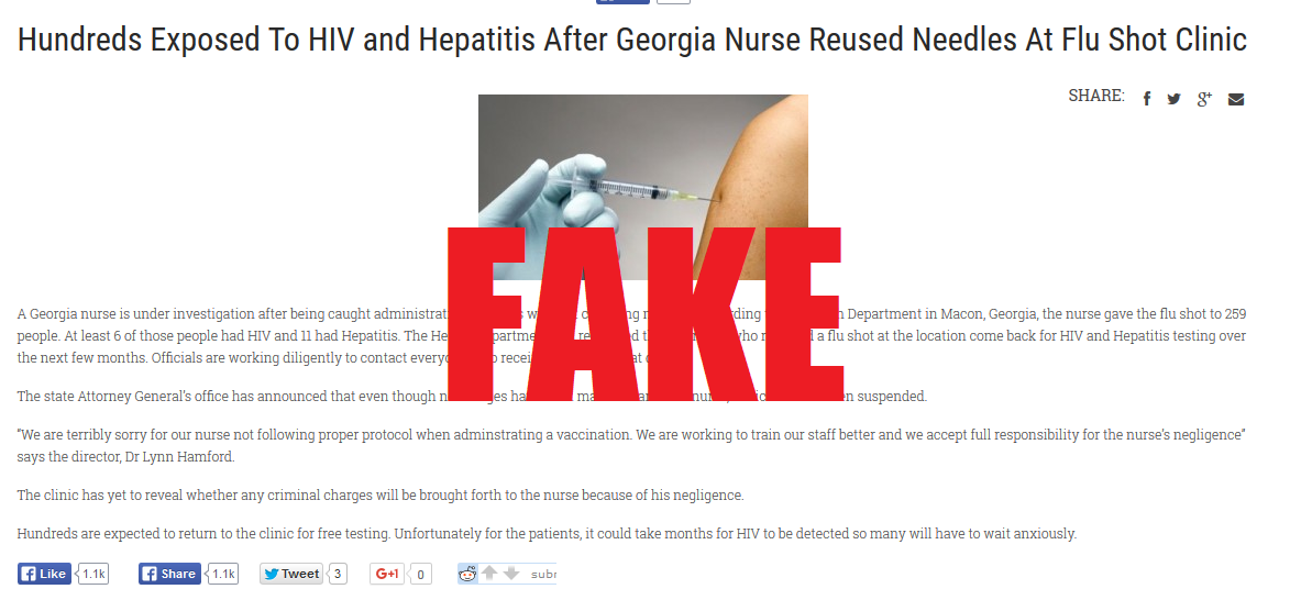 Billing itself an “entertainment and satirical” website, TMZToday.com released a chilling (albeit patently false) news item that claims hundreds of people were exposed to HIV and hepatitis via reused needles at a Macon, GA health department.