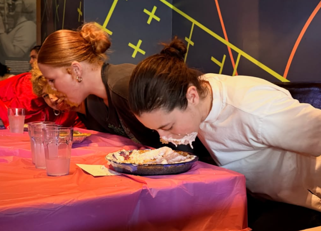 The walls reflect that intention. Gay Games posters, team photos, memorabilia, and snapshots of a queer sports lineage that rarely gets center space share the room with plates of food and pint glasses. It feels lived in, even in its first year. Rikki’s also embraces the art of joy. Their now infamous Lesbian Pie Eating Contest, created with Curve founder Franco Stevens and the Curve Foundation for Lesbian Visibility Week, brought whipped cream, laughter, and donations into one room with an ease that only queer spaces manage. The eighty-one-year-old contestant named Babs stole the show and became a small internet legend. Sara missed most of it because she was barbacking the rush.