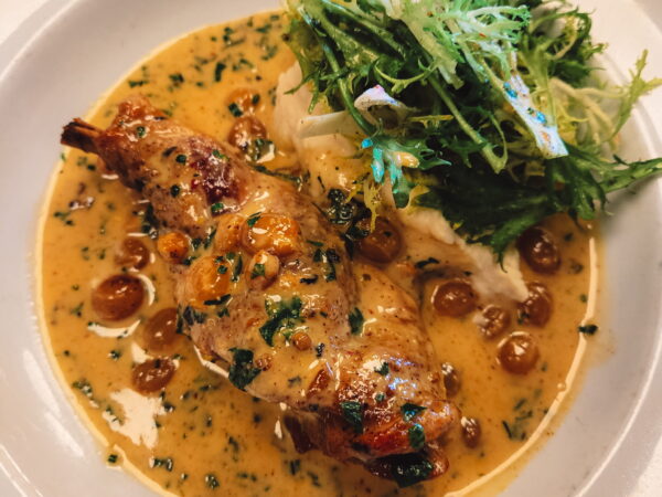 Our culinary journey began in Burgundy, a region that stands as the soul of French winemaking. Known for its legendary Pinot Noir and Chardonnay, this evening captured Burgundy’s rustic elegance. The menu offered a taste of Burgundy’s heart, from Escargot Gougère—a tender, buttery puff pastry cradling succulent escargot—to Lapin à la Moutarde—a dish of rabbit slow-cooked in a rich, tangy mustard sauce that echoed the region’s culinary history.