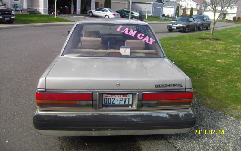 Unfortunately for gay people, these announcements do not go unanswered. Straight people decide this is “shoving their sexual orientation in everyone’s faces,” and respond with bumper stickers that read “don’t mess with marriage” or “One Man + One Woman = Family,” which is, even moreso, in everyone’s face. These are the usually people who have a minimum of 60 Christian, NObama or NRA bumper stickers on their car, showing that whatever fiscal conservatism they adhere to makes exception for spending money on sticky pieces of plastic. It gives gay people a unique challenge: they must outnumber anti-gay groups even more pieces of plastic.