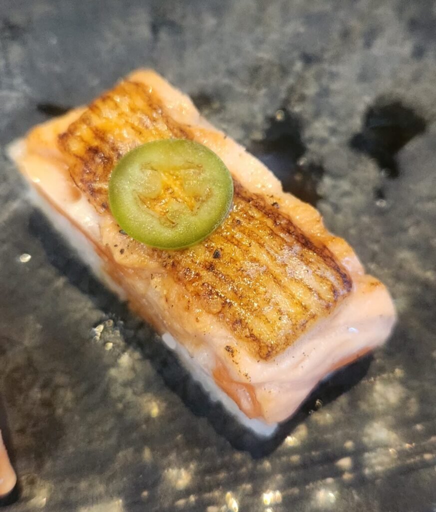 From a technical standpoint, Temaki Den is quietly impressive. Rice seasoning is restrained and precise—balanced acidity without aggression. Fish selection leans toward pristine classics rather than novelty imports, allowing quality to speak louder than gimmickry. Aburi preparations add a whisper of smoke and fat-rendering heat without overpowering the fish, while pressed and nigiri-style offerings provide moments of structure amid the looseness of hand rolls.