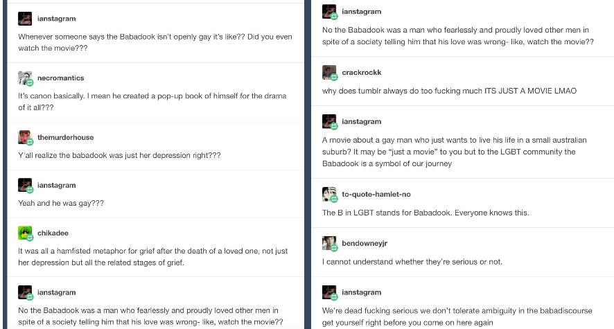 Director and creator Jennifer Kent intended for Mister Babadook to be a horror-filled metaphor for grief. Yet, tumblr user ianstagram veered the meaning off-course when they made the bold claim that the Babadook was, clearly, openly gay throughout the movie. This launched many a meme, including an unconfirmed image that The Babadook was erroneously put into the LGBTQ+ category on Netflix, and the powerful quote from queer journalist JP Brammer: “Haunting a small white family in an Australian suburb is a radical act, and the Babadook did that.”