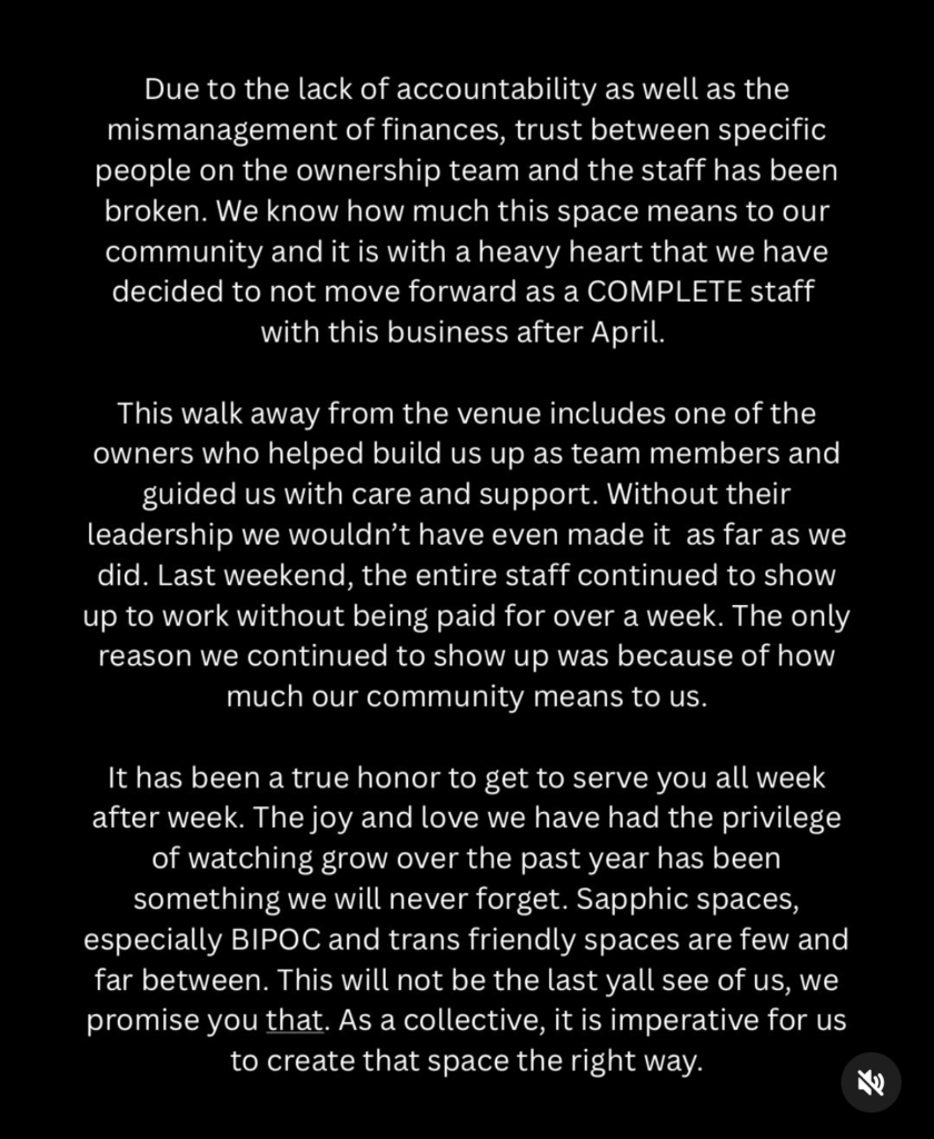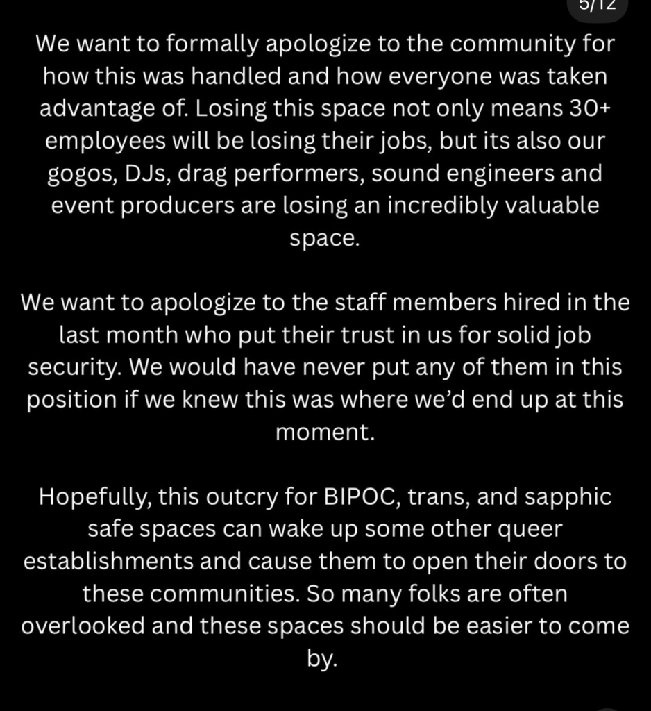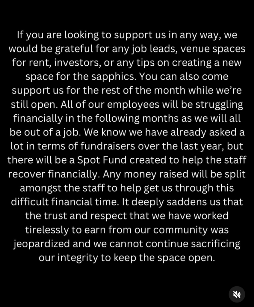In the wake of the staff post, Garcia announced that the business would not only close but dissolve its LLC immediately, rendering any further operation illegal. Garcia claimed they were blindsided by the staff’s public stance and defended the fundraiser as a genuine attempt to protect 30-plus queer jobs and maintain a sacred space for the community. Despite these intentions, the pushback from the very people who kept the bar running proved insurmountable.