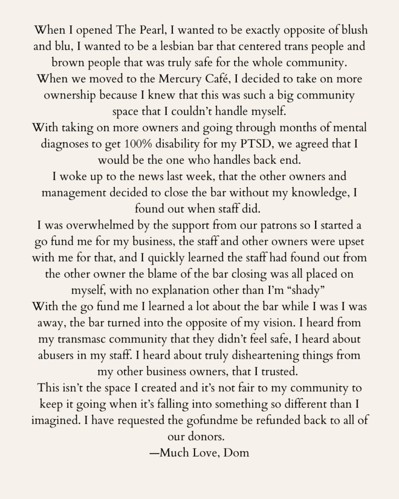 The controversy ignited shortly after the bar announced it would be closing its doors in April due to insurmountable financial pressures, including high rent at its historic Mercury Cafe location and mounting maintenance costs. However, after an overwhelming community response, part owner Dom Garcia launched a GoFundMe to save the space, quickly surpassing its $80,000 goal thanks to an outpouring of community support.