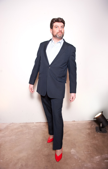 To top off the photo shoot, Niland puts the suit back on, then slips into a pair of dazzling women’s-size-14 red heels.